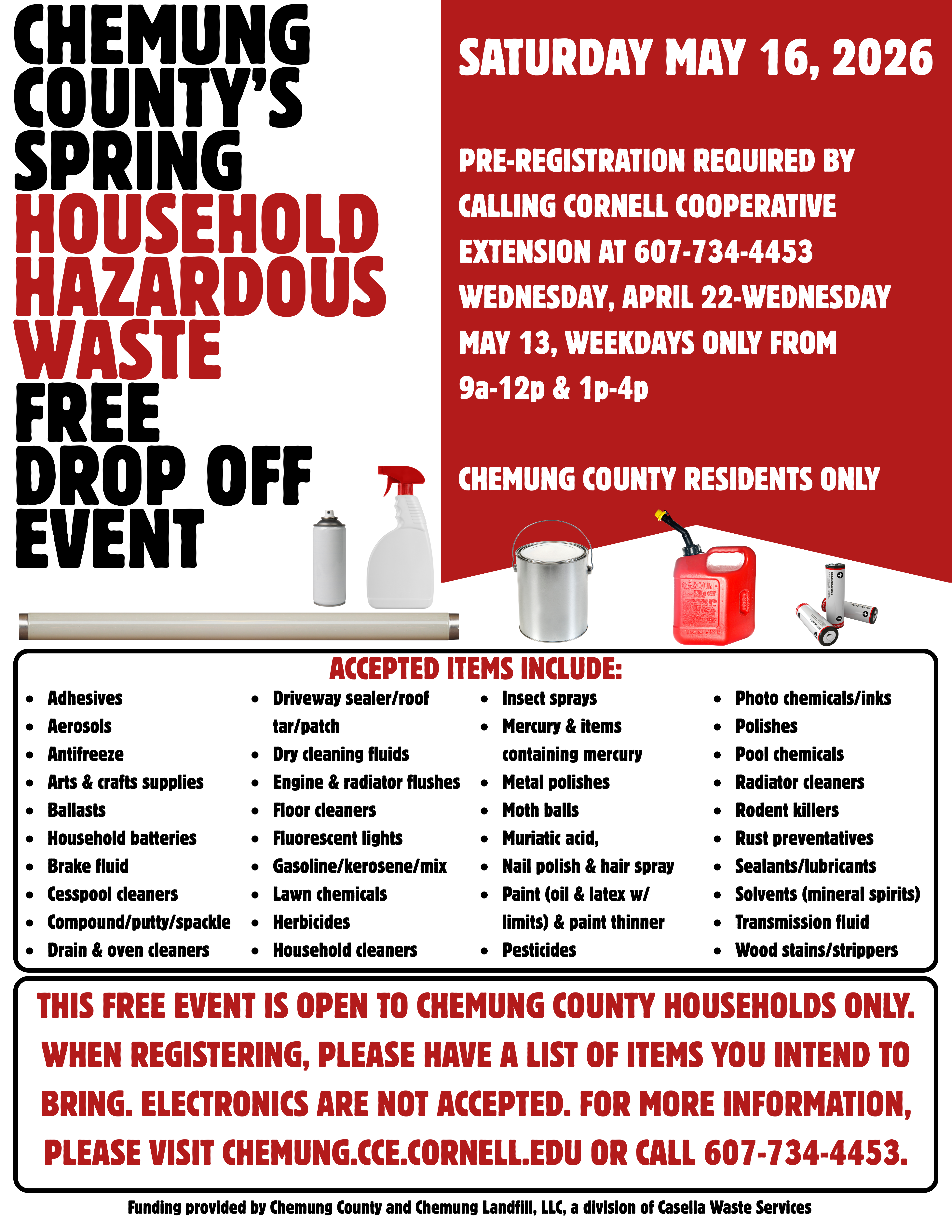 Chemung County's Spring Household Hazardous Waste Collection Event is scheduled for Saturday, May 16. Pre-registration is required by calling Cornell Cooperative Extension of Chemung County at 607-734-4453 starting Wednesday April 22 until Wednesday May 13, weekdays only from 9am-12pm & 1pm-4pm.